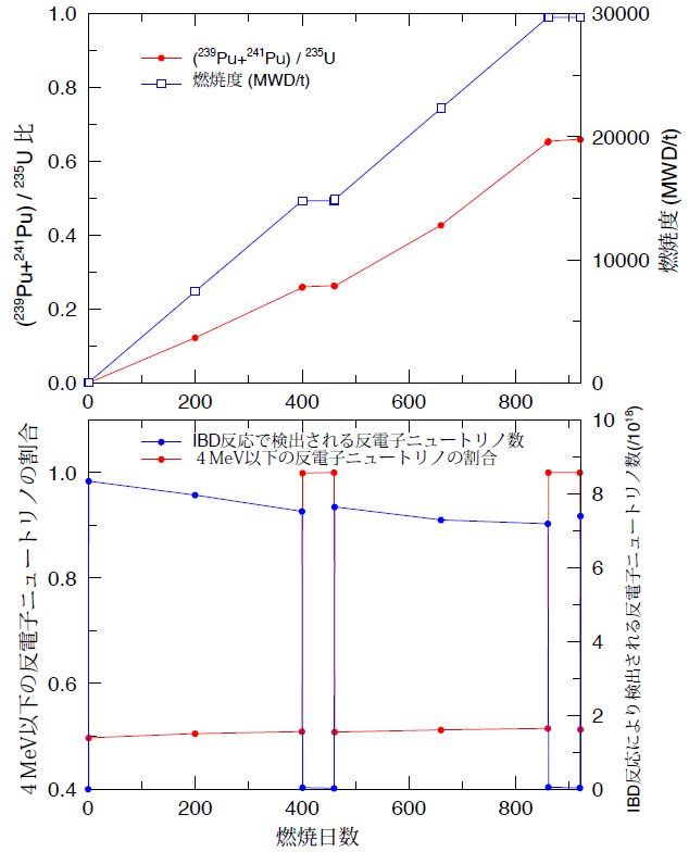 上のパネルより、燃焼(原子炉の運転)に伴って燃焼度(青線、1トン当たりの燃料が放出したエネルギー)と共に、238Uの中性子捕獲によりPu が生成されるためにPu fissileの235U に対する割合(赤線)は増加していく様子が見て取れる。また下のパネルからは、「R4指標」(赤線)が運転中は増加し、停止中は限りなく1に近づく一方、IBD 反応により検出される反電子ニュートリノの数(青線)は運転に伴うPuの蓄積により減少し、さらに停止中はその値が2桁以上も小さくなることが見て取れる。