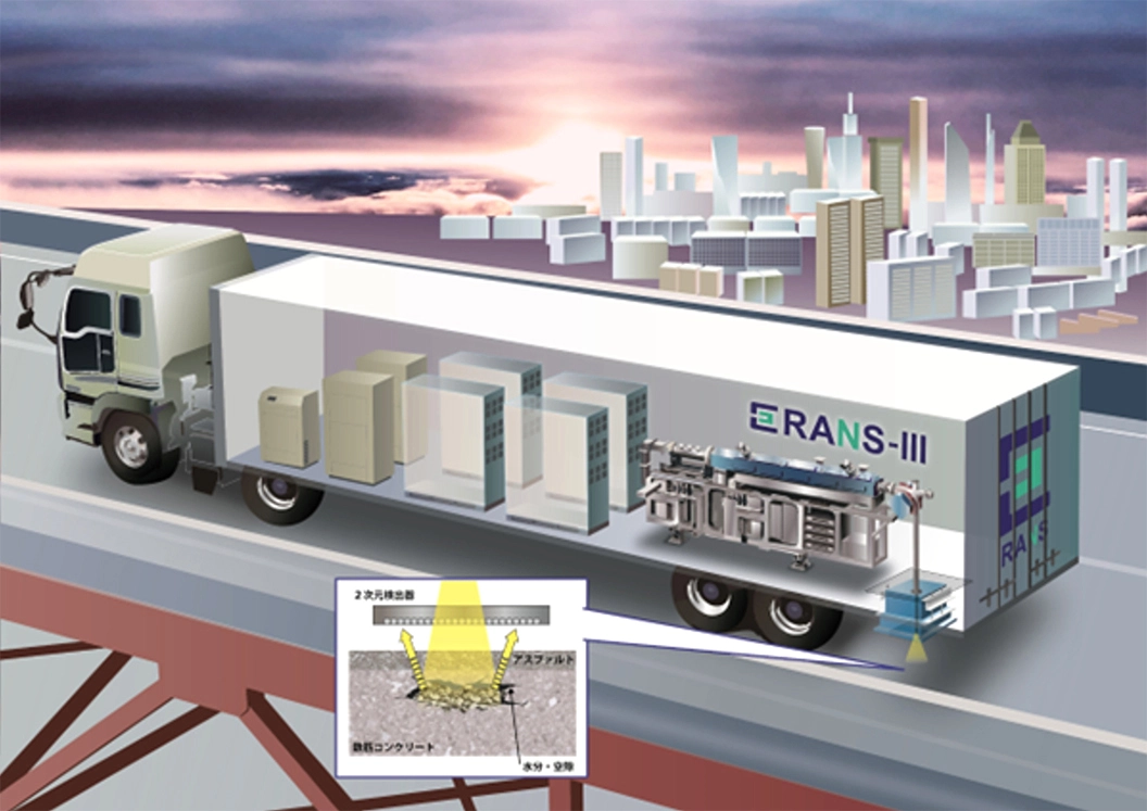 - 路面下の床版(しょうばん:荷重を受ける床。多くの場合舗装の下に設置)の内部で散乱した中性子を検出器で計測し、内部劣化状態の情報を取り出し可視化