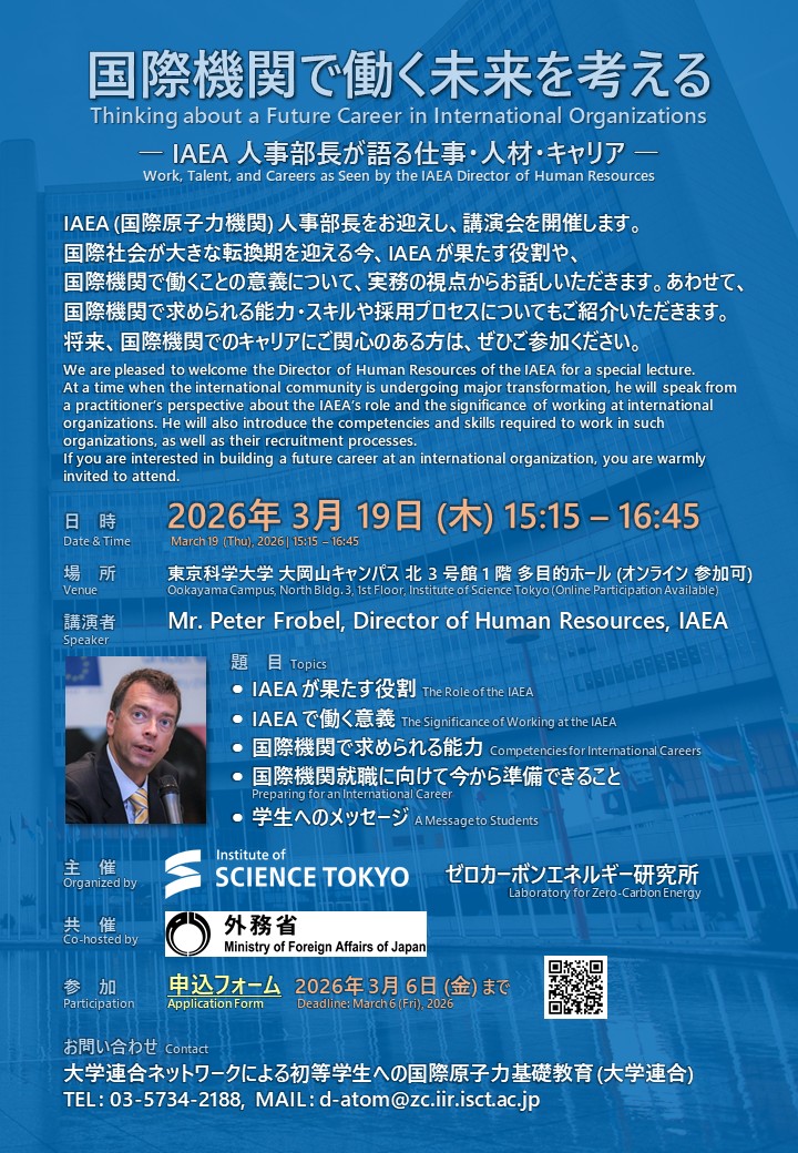 - IAEA (国際原子力機関) 人事部長をお迎えし、講演会を開催します。